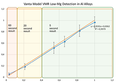 要想快速探究鋁合金當(dāng)中的少量鎂元素一直都是手持式光譜儀需要攻克的難題,因為要準(zhǔn)確地探定鋁合金當(dāng)中的鎂元素會需要很長的檢測時間。隨著經(jīng)濟不斷發(fā)展,工程師們也對硬件技術(shù)的進步以及先進的Axon技術(shù)的采用,而奧林巴斯Vanta光譜儀的技術(shù)已經(jīng)可以大大縮短鋁合金中準(zhǔn)確的低含量鎂元素的檢測時間。