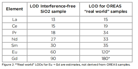 手持設(shè)備中的典型的X射線管只能工作到50 kV,稀土元素的有效激發(fā)能量差。而SciAps X-555采用55 kV的X射線管,大約能產(chǎn)生10倍以上的X射線有效激發(fā)能量。無(wú)干擾(二氧化硅)和高度具有挑戰(zhàn)性的OREAS REE礦石的值(這可以在圖2中找到)。LOD用于背景以上的3西格瑪檢測(cè),120秒的測(cè)試時(shí)間。Sciaps光譜儀可作為化探手段。有規(guī)劃的進(jìn)行土壤、巖石露頭測(cè)試,剖面測(cè)試,光譜數(shù)據(jù)可作為地質(zhì)資料。常用礦石模式和土壤模式。無(wú)需進(jìn)行樣品制備或簡(jiǎn)單樣品制備。