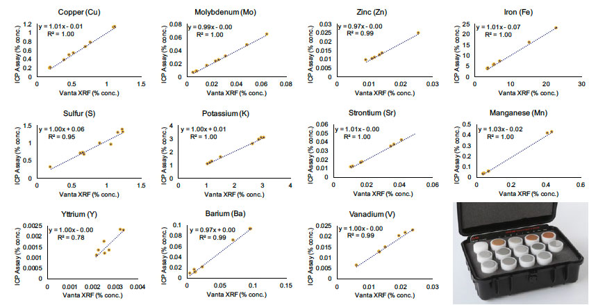 以下數(shù)據(jù)表明了Vanta手持式光譜分析儀在分析一系列由OREAS(礦石研究和勘探分析標(biāo)準(zhǔn)公司)提供的斑巖銅認(rèn)證參考樣品(CRM)和IOCG(氧化鐵銅金)pXRF商用試劑盒樣品時(shí)表現(xiàn)出的開(kāi)箱即用性。CRM數(shù)據(jù)與Vanta手持式光譜分析儀所獲得的數(shù)據(jù)高度吻合,表明Vanta手持式XRF分析儀在分析采自這些礦床類型的完全制備好的樣品時(shí)可提供高質(zhì)量的數(shù)據(jù)。