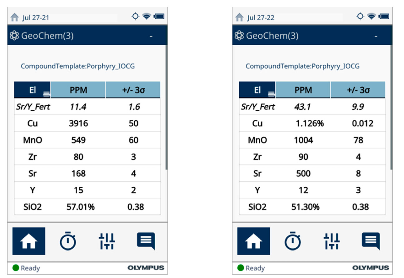 在實(shí)驗(yàn)室中測(cè)量的鍶(Sr)、釔(Y)、氧化錳(MnO)、二氧化硅(SiO2)和鋯(Zr)的不同比例組合可用于有效區(qū)分斑巖銅環(huán)境中的成礦特性和妨礙成礦的侵入體。最近,澳大利亞塔斯馬尼亞大學(xué)礦床和地球科學(xué)中心(CODES)和英國(guó)萊斯特大學(xué)地理、地質(zhì)和環(huán)境學(xué)院都對(duì)手持式分析儀在現(xiàn)場(chǎng)檢測(cè)制備好和未制備樣品以幫助勘探人員評(píng)估斑巖可開(kāi)采性的能力進(jìn)行了研究。