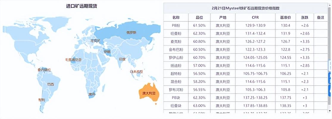 截至2月21日下午收盤,大商所鐵礦石期貨主力合約報收919元/噸,上漲3.43%,創(chuàng)下近九個月來價格新高,較去年10月底上漲超50%。西南期貨數(shù)據(jù)顯示,目前進口礦報價已逼近130美元/噸,較今年初上漲約10%。