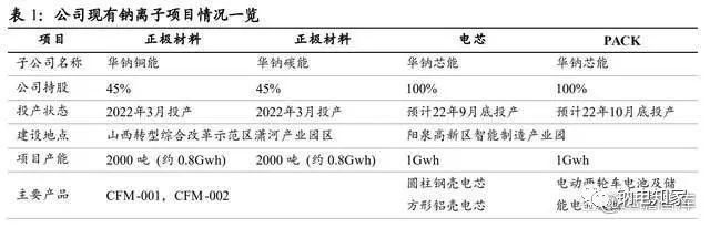 100%持股的華鈉芯能為鈉離子電池電芯廠的運(yùn)營主體,1Gwh 電芯項(xiàng)目于 2022 年 7 月在陽泉市高新區(qū)進(jìn)行開工儀式,據(jù)公司公告:山西華陽集團(tuán)新能股份有限公司(以下簡稱“公司”)的全資孫公司山西華鈉芯能科技有限責(zé)任公司投資建設(shè)的鈉離子電芯生產(chǎn)線設(shè)備安裝調(diào)試已完成,公司于 2022 年 9 月 30 日在陽泉市高新區(qū)高端制造產(chǎn)業(yè)園區(qū)舉辦鈉離子電芯生產(chǎn)線出品儀式。公司鈉離子電芯的出品,為鈉離子電池產(chǎn)業(yè)高質(zhì)量發(fā)展奠定了扎實(shí)基礎(chǔ)。