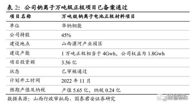 據(jù)山西轉(zhuǎn)型綜改示范區(qū)行政審批局2022年度 7 月企業(yè)投資項(xiàng)目備案結(jié)果公示表,公司萬噸級鈉離子電池正極材料項(xiàng)目已審核通過,且 11 月開工。