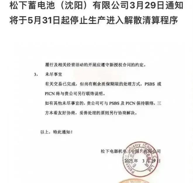 近日,位列世界500強(qiáng)企業(yè)松下株式會(huì)社旗下公司松下蓄電池(沈陽(yáng))工廠發(fā)布了一份公告,宣布將會(huì)在2023年5月31日前全面停止生產(chǎn),進(jìn)入解散清算程序并不再開(kāi)展任何經(jīng)營(yíng)活動(dòng)。意味著這個(gè)從1994年來(lái)沈陽(yáng)投資建廠的企業(yè)結(jié)束了29年的生產(chǎn),正式退出了中國(guó)市場(chǎng)。