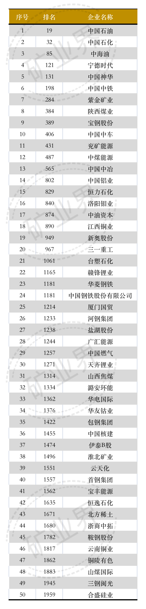整理發(fā)現(xiàn),上榜的中國(guó)礦業(yè)相關(guān)企業(yè)共有50家,中國(guó)石油、中國(guó)石化和中海油這“三桶油”與上年相比,依然穩(wěn)坐中國(guó)礦業(yè)相關(guān)企業(yè)前三甲寶座。其中,中海油排名升幅最大,從去年第133位升至今年第85位 。