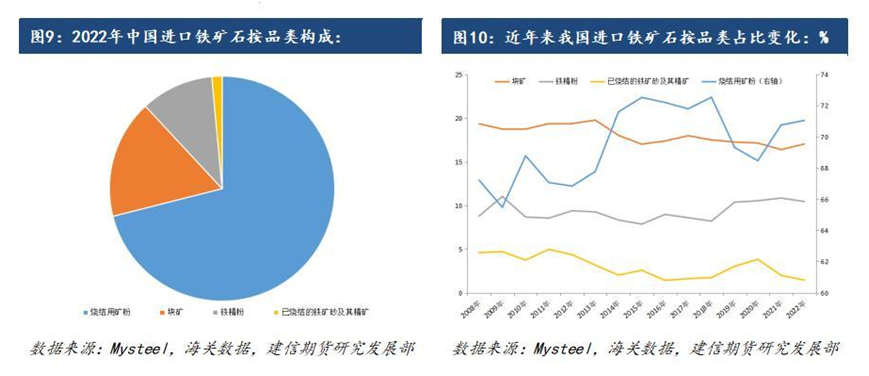 從近年來進口鐵礦石品類占比圖來看,燒結(jié)用粉礦占比整體震蕩上升,2015年達到72.5%高位,受巴西淡水河谷礦難和全球新冠疫情影響,燒結(jié)用粉礦溢價上升,2019-2020年我國進口礦中燒結(jié)用粉礦占比明顯回落至68.5%,近兩年又再度回升至71.0%;