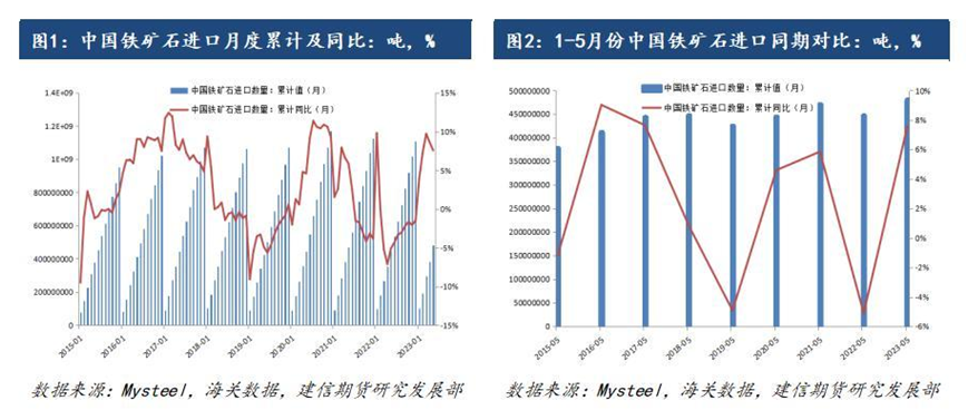 據(jù)我的鋼鐵網(wǎng)數(shù)據(jù)顯示,今年1-5月份中國鐵礦石進口量達到4.8075億噸,同比增長7.7%,從絕對值數(shù)量上來說,已經(jīng)超過2021年同期的最高值4.7093億噸,再創(chuàng)歷史同期新高。從今年1-5月份進口數(shù)據(jù)來看,2023年我國鐵礦石進口規(guī)模或再度走高,不排除將創(chuàng)下歷年鐵礦石進口量新高的可能。