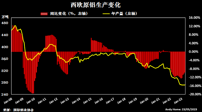 過去15年中,西歐原鋁產(chǎn)量持續(xù)下降,從過去的450萬噸降至目前的270萬噸。