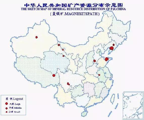 中國是世界上菱鎂礦資源最為豐富的國家??偙S袃α康V石30億噸,居世界第1位。我國菱鎂礦的重要特點是地區(qū)分布不廣、儲量相對集中,大型礦床多。探明儲量的礦區(qū)27處,分布于9個?。▍^(qū)),以遼寧菱鎂礦儲量最為豐富,占全國的85.6%。