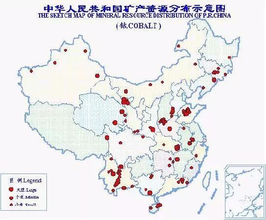 中國鈷礦資源不多,獨立鈷礦床尤少,主要作為伴生礦產(chǎn)與鐵、鎳、銅等其他礦產(chǎn)一道產(chǎn)出。已知鈷礦產(chǎn)地150處,分布于24個?。▍^(qū)),以甘肅省儲量最多,約占全國總儲量的30%。全國總保有儲量鈷47萬噸。