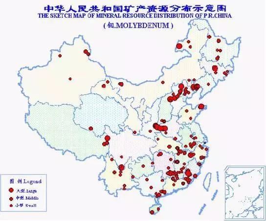 中國鉬礦資源豐富,總保有儲量鉬840萬噸,居世界第2位。探明儲量的礦區(qū)有222處,分布于28個?。▍^(qū)、市)。以河南省鉬礦資源為最豐富,鉬儲量占全國總儲量的30.1%。