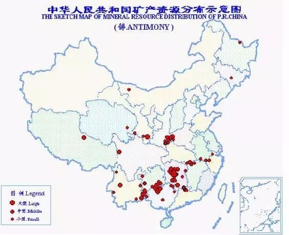 中國是世界上銻礦資源最為豐富的國家??偙S袃α夸R278萬噸,居世界第1位。已探明儲量的礦區(qū)有111處,分布于全國18個省(區(qū)),以廣西銻儲量為最多,約占全國的41.3%;其次為湖南、云南、貴州、甘肅、廣東等省。