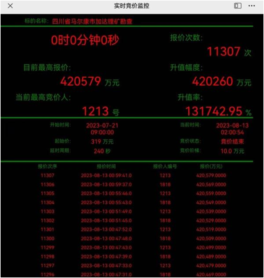 值得注意的是,三天前(8月11日),四川能投資本控股有限公司以10.1億元的價格拍得四川省金川縣李家溝北鋰礦探礦權(quán)。該筆競價交易同樣鏖戰(zhàn)2天,報(bào)價次數(shù)3412次,較57萬元起拍價升值超1771倍。