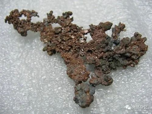 自然銅是地質(zhì)作用中還原條件下的產(chǎn)物,形成于原生熱液礦床;也見(jiàn)于含銅硫化物礦床氧化帶下部,常與赤鐵礦、孔雀石、輝銅礦等伴生,由銅的硫化物還原而成: