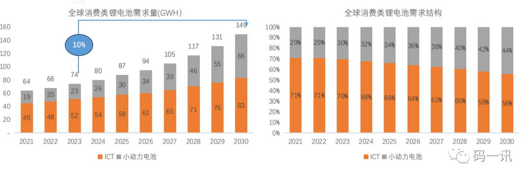 參考多個機構(gòu)數(shù)據(jù),未來消費類電池需求以10%增速發(fā)展,預(yù)計30年總體需求144GWh, 其中ICT占56%份額,小型動力電池44%;