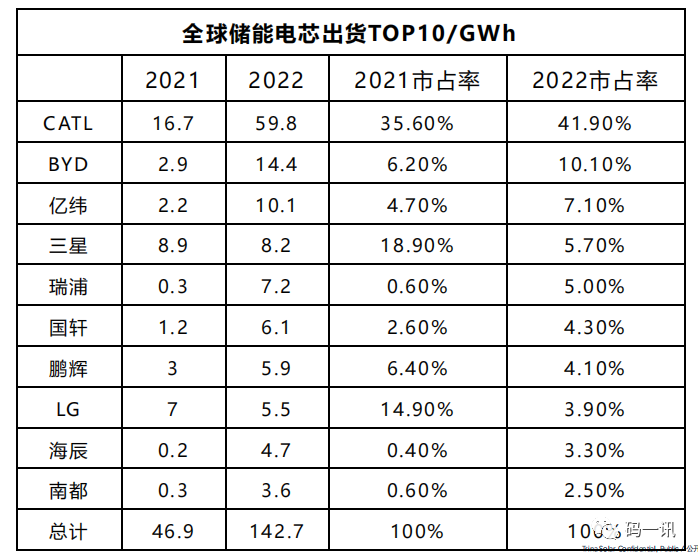 2022年全球大儲的出貨量量達(dá)到50GWh,環(huán)比21年上漲一倍,預(yù)計23年出貨量會繼續(xù)保持超過100%的增長。