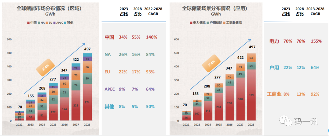 電力儲能會長期占據(jù)儲能市場的大頭,預(yù)計28年占整體市場的76%。