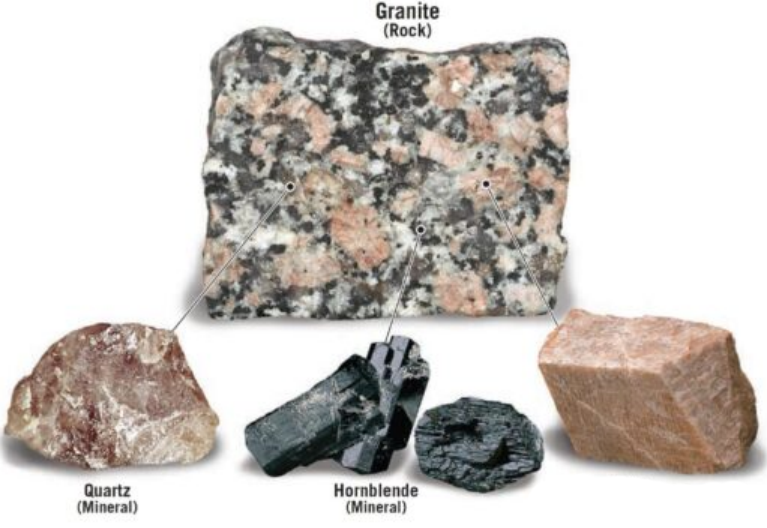巖石的構(gòu)成:如前所述,巖石由礦物或礦物質(zhì)組成。巖石的組成取決于其中存在的礦物。有些巖石可能由單一礦物組成,而其他巖石可能含有多種礦物。例如,花崗巖主要由石英、長石和云母組成,而玄武巖主要由斜長石和輝石組成。礦物的構(gòu)成:礦物是具有特定化學(xué)配方的元素化合物。它們是巖石的基本組成部分,并且可以根據(jù)它們獨(dú)特的物理和化學(xué)特性來識(shí)別。一些常見的礦物包括石英、長石、云母、方解石和赤鐵礦,每種都有其獨(dú)特的特征。