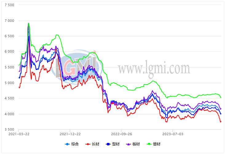 具體來看,蘭格鋼鐵長材絕對價格指數(shù)為3766元,較去年同期下降14.8%;蘭格鋼鐵型材絕對價格指數(shù)為3997元,較去年同期下降12.5%;蘭格鋼鐵板材絕對價格指數(shù)為4175元,較去年同期下降11.1%;蘭格鋼鐵管材絕對價格指數(shù)為4518元,較去年同期下降10.6%。