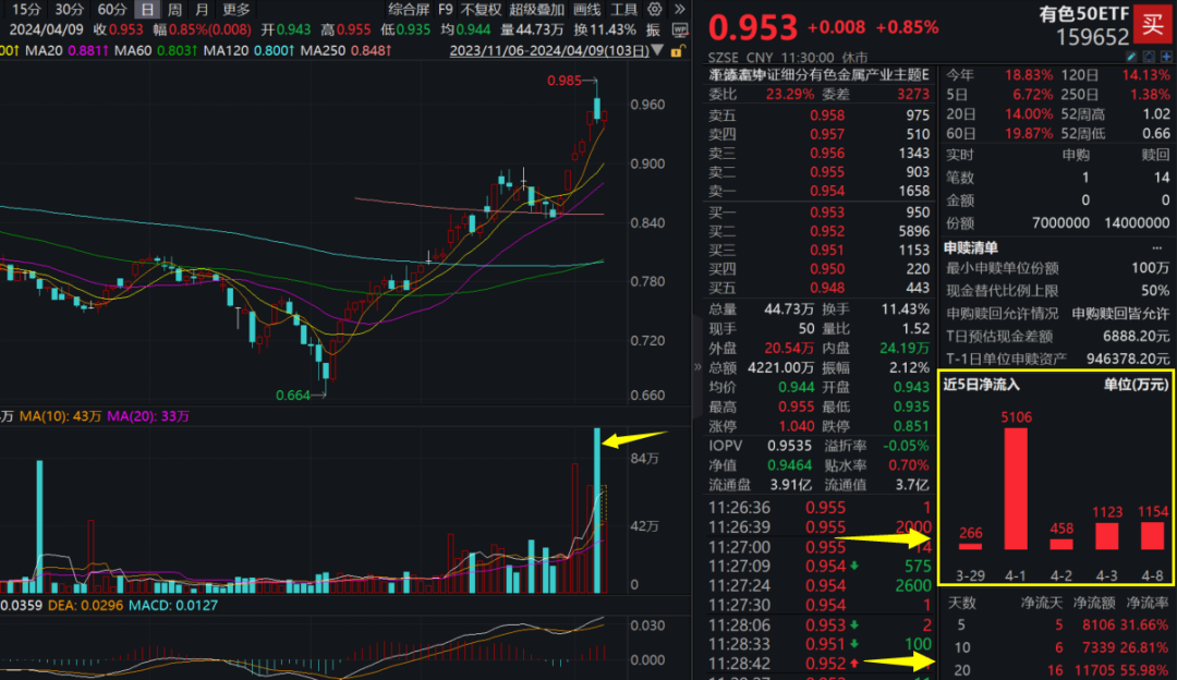 4月8日,有色50ETF(159652)標(biāo)的指數(shù)單日成交額達(dá)1億元,刷新自2023年2月上市第二日以來最高單日成交額紀(jì)錄!資料顯示,其為全市場銅含量最高的有色指數(shù),其“含銅量”達(dá)26.06%。