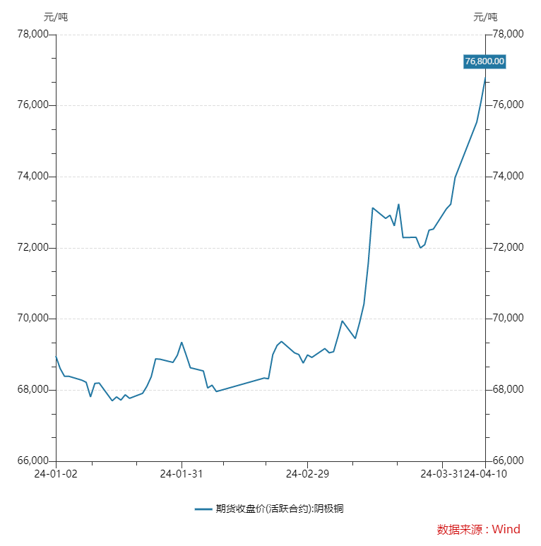 今年以來銅價(jià)持續(xù)震蕩上行。具體來看,國內(nèi)方面,wind數(shù)據(jù)顯示,截至4月10日下午收盤,滬銅主連報(bào)76800元/噸,較上個(gè)交易日上漲0.66%,1月至今,銅價(jià)持續(xù)攀升,較年初上漲7840元/噸,漲幅達(dá)11.4%。國際方面,截至2024年4月8日收盤,LME銅報(bào)9443美元/噸,國內(nèi)國外分別創(chuàng)下近兩年和近一年的價(jià)格新高。