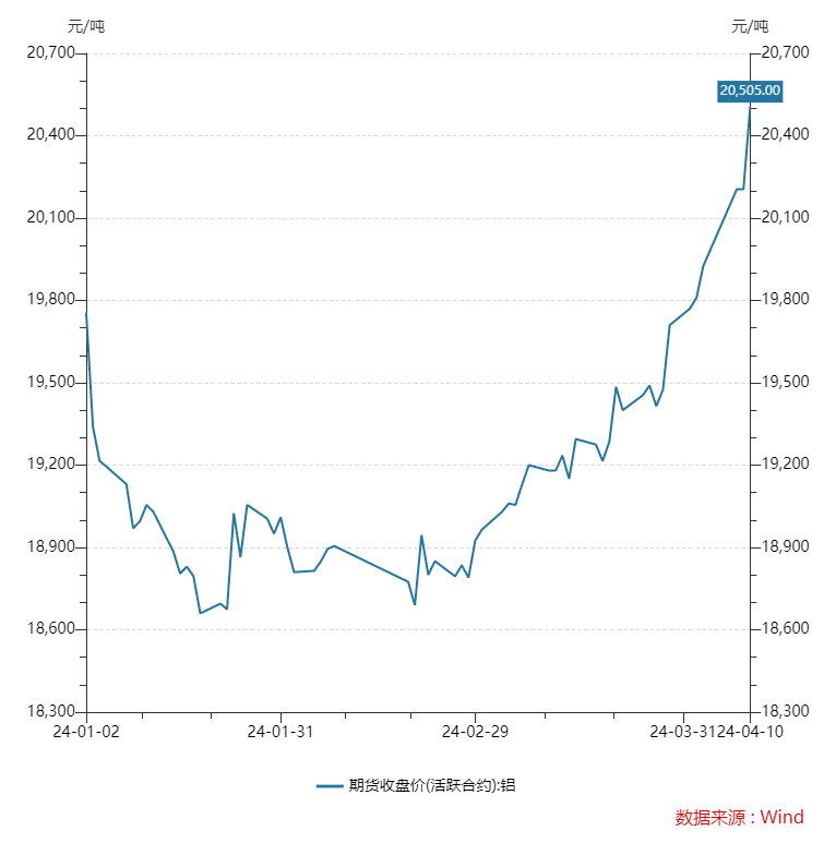 同樣一路“高歌猛進(jìn)”的還有鋁價(jià),截至4月10日下午收盤,滬鋁主連報(bào)20505元/噸,較上個(gè)交易日上漲1.38%,較年初上漲750元/噸,創(chuàng)下自2022年7月以來的價(jià)格新高。而LME鋁在4月8日收盤報(bào)2459美元/噸,較前一交易日上漲0.33%。