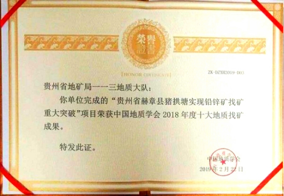 豬拱塘鉛鋅礦是地質(zhì)找礦新機(jī)制“商業(yè)跟進(jìn)”的又一成功范例,其重大找礦成果被業(yè)界高度認(rèn)可,先后榮獲中國地質(zhì)學(xué)會頒發(fā)“2018年度十大地質(zhì)找礦成果獎”、第七屆“中國有色金屬地質(zhì)找礦成果獎”一等獎。