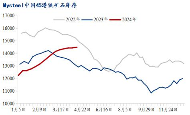 港口庫存方面,4月15日,中國45港進口鐵礦石庫存總量14656.54萬噸,環(huán)比上周一增加190萬噸,47港庫存總量15296.54萬噸,環(huán)比增加245萬噸。目前累庫有所放緩,五一節(jié)前鋼廠補庫力度,廠內庫存或小幅增加,后續(xù)在疏港增加之下,港口庫存或逐步迎來庫存拐點,但4月份仍難降庫。