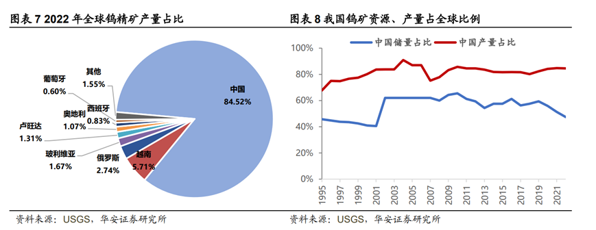 同時,中國也是世界上鎢產量最豐富的國家。根據(jù)美國地調局(USGS)統(tǒng)計,2022年全球鎢礦產量8.4萬噸,其中中國產量7.1萬噸,約占全球總產量的84.5%。