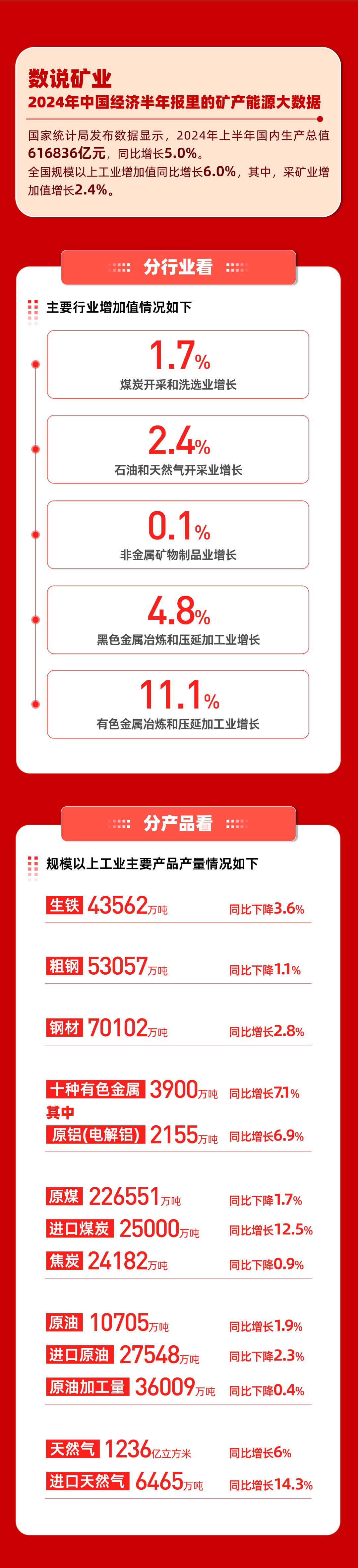 7月15日,國家統(tǒng)計局公布2024年經(jīng)濟半年報。2024年上半年國民經(jīng)濟運行總體平穩(wěn),國內(nèi)生產(chǎn)總值超60萬億元,同比增長5%。全國規(guī)模以上工業(yè)增加值同比增長6%,其中,采礦業(yè)增加值增長2.4%。
