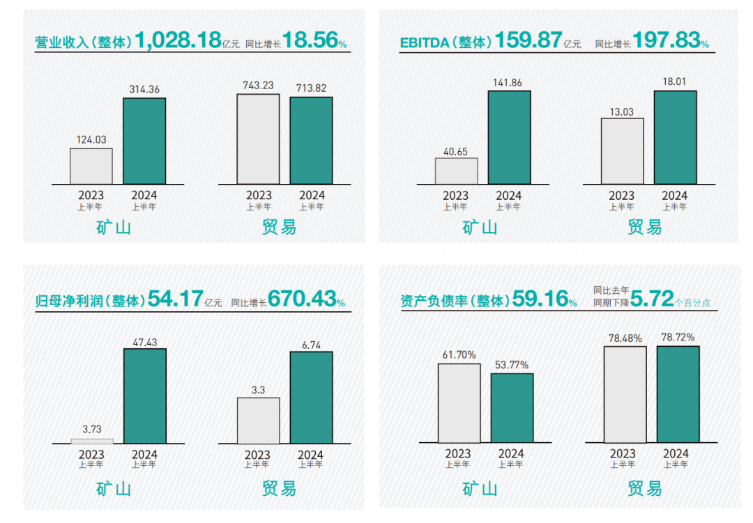 8月23日晚,洛陽鉬業(yè)發(fā)布的2024年中期報(bào)告顯示,上半年公司實(shí)現(xiàn)營業(yè)收入1028.18億元,同比增長18.56%,實(shí)現(xiàn)歸母凈利潤54.17億元,同比增長670.43%,均創(chuàng)下歷史新高;實(shí)現(xiàn)息稅折攤前利潤159.87億元,增長197.83%,資產(chǎn)負(fù)債率59.16%,同比下降5.72個(gè)百分點(diǎn)。同時(shí),公司流動(dòng)性充裕,上半年經(jīng)營性凈現(xiàn)金流108億元,持有現(xiàn)金及現(xiàn)金等價(jià)物309億元。