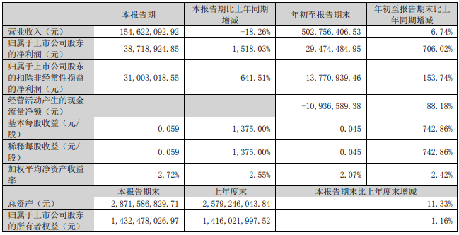 近日,云南鍺業(yè)發(fā)布財(cái)報(bào),今年前三季度,公司實(shí)現(xiàn)營(yíng)業(yè)收入5.03億元,同比增長(zhǎng)6.74%;歸屬于上市公司股東的凈利潤(rùn)2947.45萬(wàn)元,同比增長(zhǎng)706.02%。