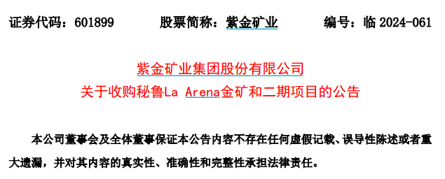 此次收購對價包括交割時一次性支付的2.45億美元,以及二期項目商業(yè)化生產(chǎn)后5000萬美元的或有付款和二期1.5%黃金凈冶煉收益的權(quán)益金。這是繼10月收購加納Akyem金礦后,紫金礦業(yè)今年又一次海外并購。