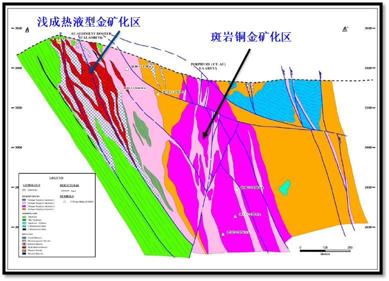La Arena項目有兩種礦床類型,分別為西南部的高硫淺成低溫?zé)嵋盒徒鸬V床和東北部的斑巖型銅金礦床,礦體整體呈“上金下銅”狀態(tài)分布。