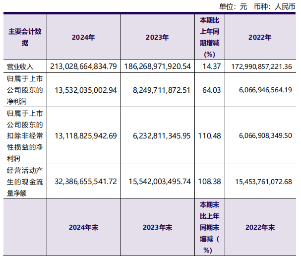 3月21日,洛陽鉬業(yè)發(fā)布的業(yè)績報(bào)告顯示,公司2024年?duì)I業(yè)收入首次邁入兩千億元門檻,為2130.29億元,同比增長14.37%;歸母凈利潤首破百億元,為135.32億元,同比增長64.03%;扣非后歸母凈利潤131.19億元,同比增長110.48%;每股收益0.63元,同比增長65.79%。