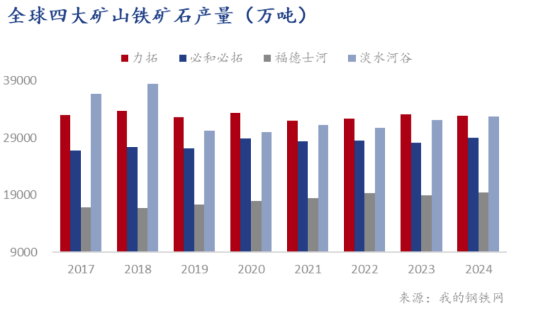 據(jù)統(tǒng)計(jì),四大礦山2024年鐵礦石總產(chǎn)量達(dá)11.39億噸,同比增加1600萬(wàn)噸,增幅1.4%。具體來(lái)看,澳大利亞三大礦山巨頭表現(xiàn)相對(duì)平穩(wěn),合計(jì)產(chǎn)量超過(guò)8億噸,同比增長(zhǎng)930萬(wàn)噸,而巴西的淡水河谷表現(xiàn)則相對(duì)突出,淡水河谷2024年鐵礦石產(chǎn)量達(dá)到3.28億噸,同比增加652萬(wàn)噸,超過(guò)原定的3.1-3.2億噸指導(dǎo)目標(biāo),創(chuàng)下2018年以來(lái)的新高。同時(shí),淡水河谷全年鐵礦石銷(xiāo)量實(shí)現(xiàn)了約3.07億噸,同比增長(zhǎng)4.02%,達(dá)到了2019年以來(lái)最好的銷(xiāo)量數(shù)據(jù)。