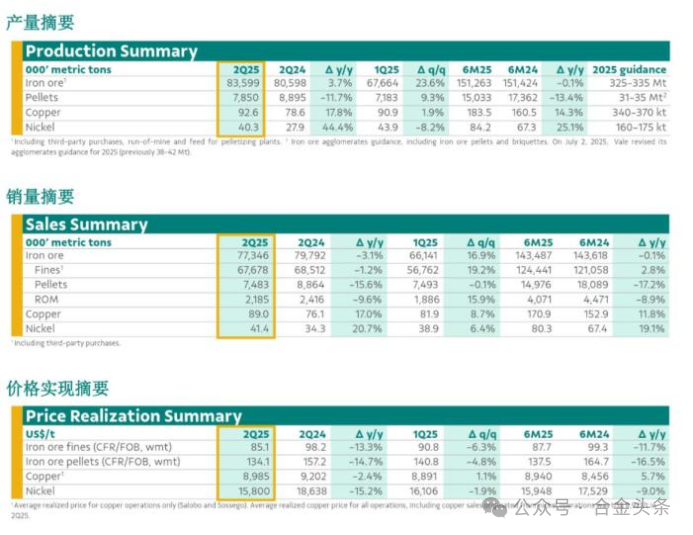 2025年第二季度,鐵礦石產(chǎn)量總計(jì)為8360萬(wàn)噸,同比增長(zhǎng)300萬(wàn)噸,增幅為4%。主要驅(qū)動(dòng)因素為布魯庫(kù)圖(Brucutu)運(yùn)營(yíng)區(qū)隨著第四條選礦生產(chǎn)線(xiàn)啟動(dòng)試運(yùn)行而取得強(qiáng)勁業(yè)績(jī),以及S11D礦區(qū)創(chuàng)下第二季度產(chǎn)量新紀(jì)錄。球團(tuán)產(chǎn)量總計(jì)為790萬(wàn)噸,同比減少100萬(wàn)噸,減幅為12%,符合修訂后的2025年產(chǎn)量指導(dǎo)目標(biāo)。鐵礦石銷(xiāo)量總計(jì)為7730萬(wàn)噸,同比減少240萬(wàn)噸,減幅為3%,系因公司實(shí)施了產(chǎn)品組合優(yōu)化戰(zhàn)略而優(yōu)先供應(yīng)中品位產(chǎn)品所致。