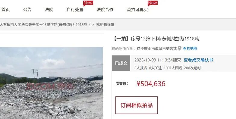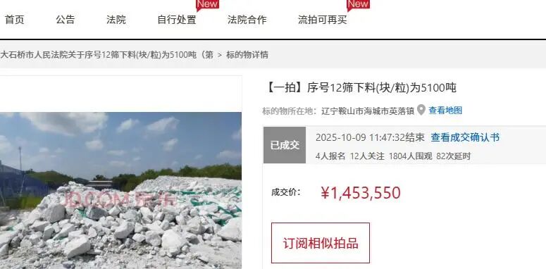 值得注意的是,也是在10月9日,同樣是存放在遼南鎂礦耐火材料廠(chǎng)青山懷鎂礦廠(chǎng)區(qū)內(nèi)的另外一批礦石也是被拍賣(mài),礦石重量為1918噸,不過(guò)從圖片來(lái)看,礦石質(zhì)量要差一些。