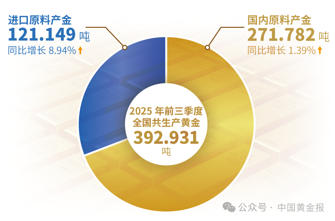 黃金生產(chǎn) 據(jù)中國黃金協(xié)會最新統(tǒng)計數(shù)據(jù)顯示:2025年前三季度,國內(nèi)原料產(chǎn)金271.782噸,比2024年同期增加3.714噸,同比增長1.39%。另有進(jìn)口原料產(chǎn)金121.149噸,同比增長8.94%。國內(nèi)原料和進(jìn)口原料共計生產(chǎn)黃金392.931噸,同比增長3.6%。