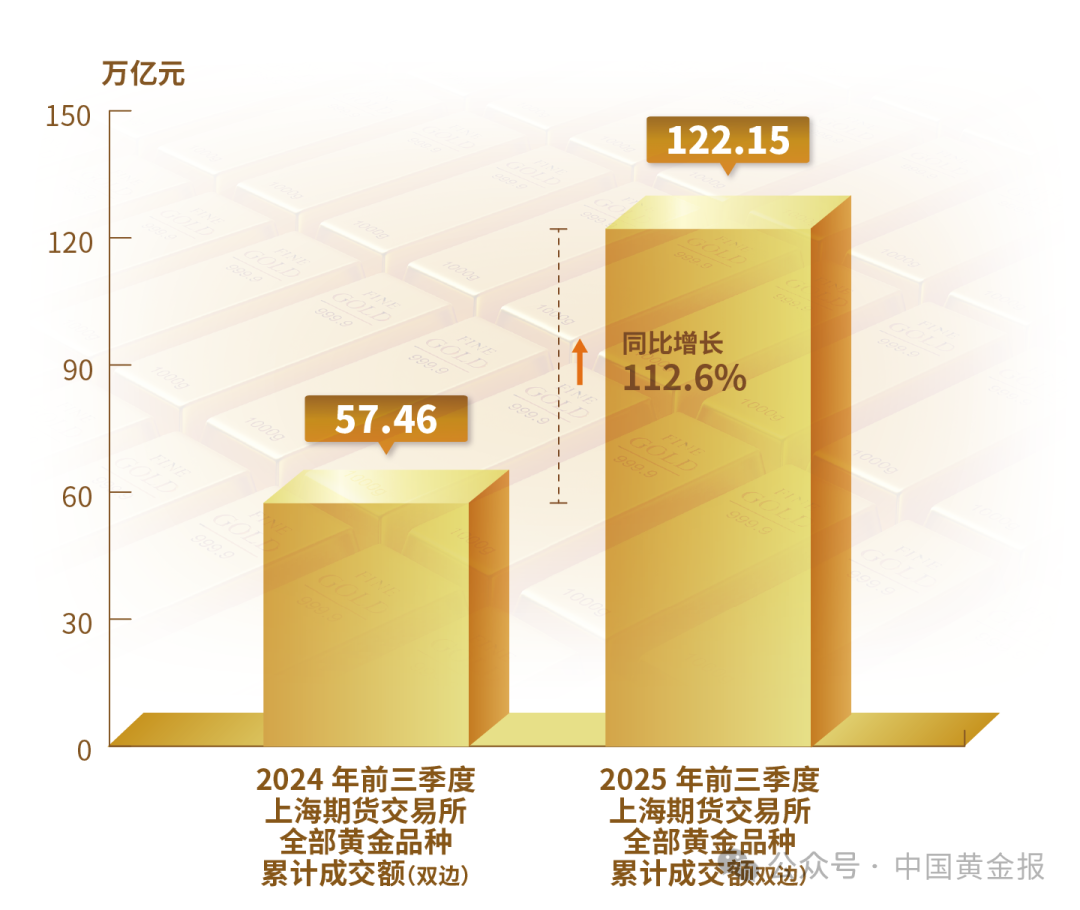 不同品類黃金產(chǎn)品的表現(xiàn)差異明顯。輕克重、附加值高的首飾產(chǎn)品仍保持較強(qiáng)市場吸引力,銷售情況較好。金條需求仍然旺盛,地緣沖突加劇與經(jīng)濟(jì)不確定性使得黃金避險保值的功能進(jìn)一步凸顯。電子、新能源等產(chǎn)業(yè)的快速發(fā)展使得工業(yè)用金需求穩(wěn)步回升。 黃金市場 2025年前三季度,上海黃金交易所全部黃金品種累計成交量單邊2.38萬噸(雙邊4.76萬噸),同比上升2.45%;累計成交額單邊17.68萬億元(雙邊35.35萬億元),同比上升41.55%。上海期貨交易所全部黃金期貨期權(quán)累計成交量單邊10.36萬噸(雙邊20.72萬噸),同比上升59.98%;累計成交額單邊61.08萬億元(雙邊122.15萬億元),同比上升112.6%。