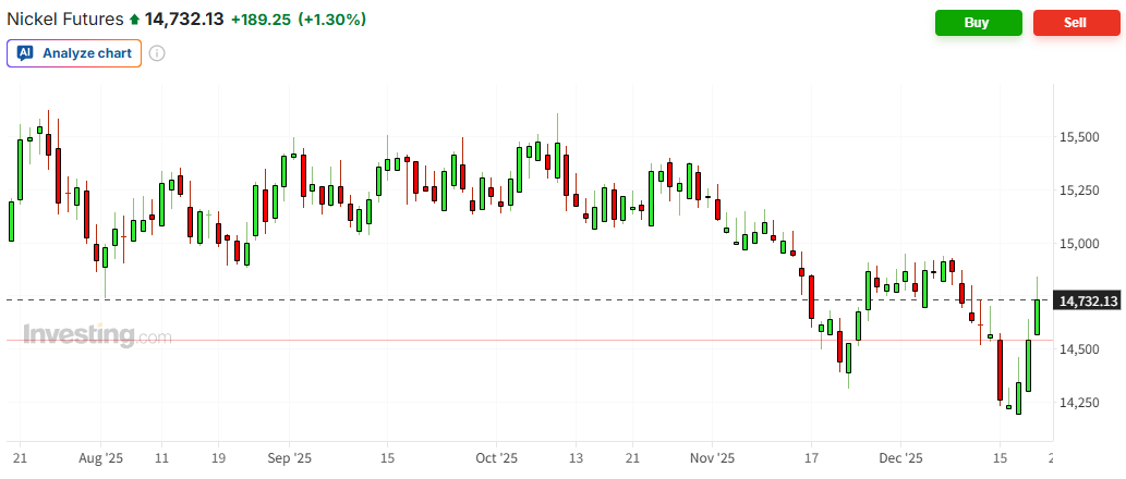 周五(12月19日)歐洲時段,倫敦金屬交易所(LME)期鎳價格漲約1.3%,報每噸14732美元。周三時,鎳價一度跌破14200美元,創(chuàng)今年4月以來的最低水平。