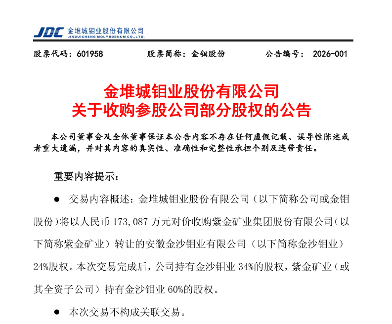 2026年1月,安徽金寨沙坪溝鉬礦迎來兩大關(guān)鍵節(jié)點(diǎn):本月19日,紫金礦業(yè)以17.3億元轉(zhuǎn)讓項(xiàng)目24%股權(quán)給金鉬股份,達(dá)成強(qiáng)強(qiáng)聯(lián)合開發(fā)共識(shí)。