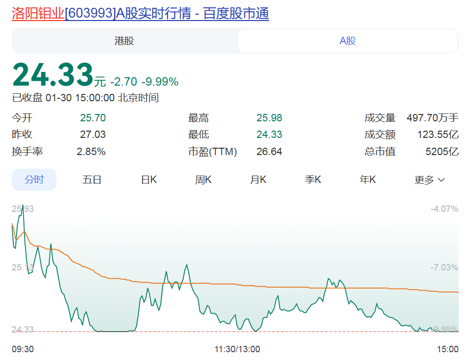1月30日,A股有色金屬板塊震蕩下行。截止1月30日下午3點(diǎn)收盤(pán),洛陽(yáng)欒川鉬業(yè)集團(tuán)股份有限公司(以下簡(jiǎn)稱(chēng)“洛陽(yáng)鉬業(yè)”)總市值達(dá)到5205.24億元。盡管與上一個(gè)交易日相比,有不小的跌幅,但依然維持在5000億元以上的高點(diǎn)。