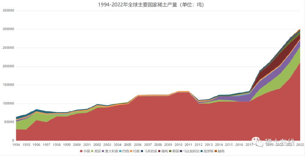 2022年全球稀土礦產(chǎn)量竟達(dá)到了30萬噸,而中國占比提升至70%